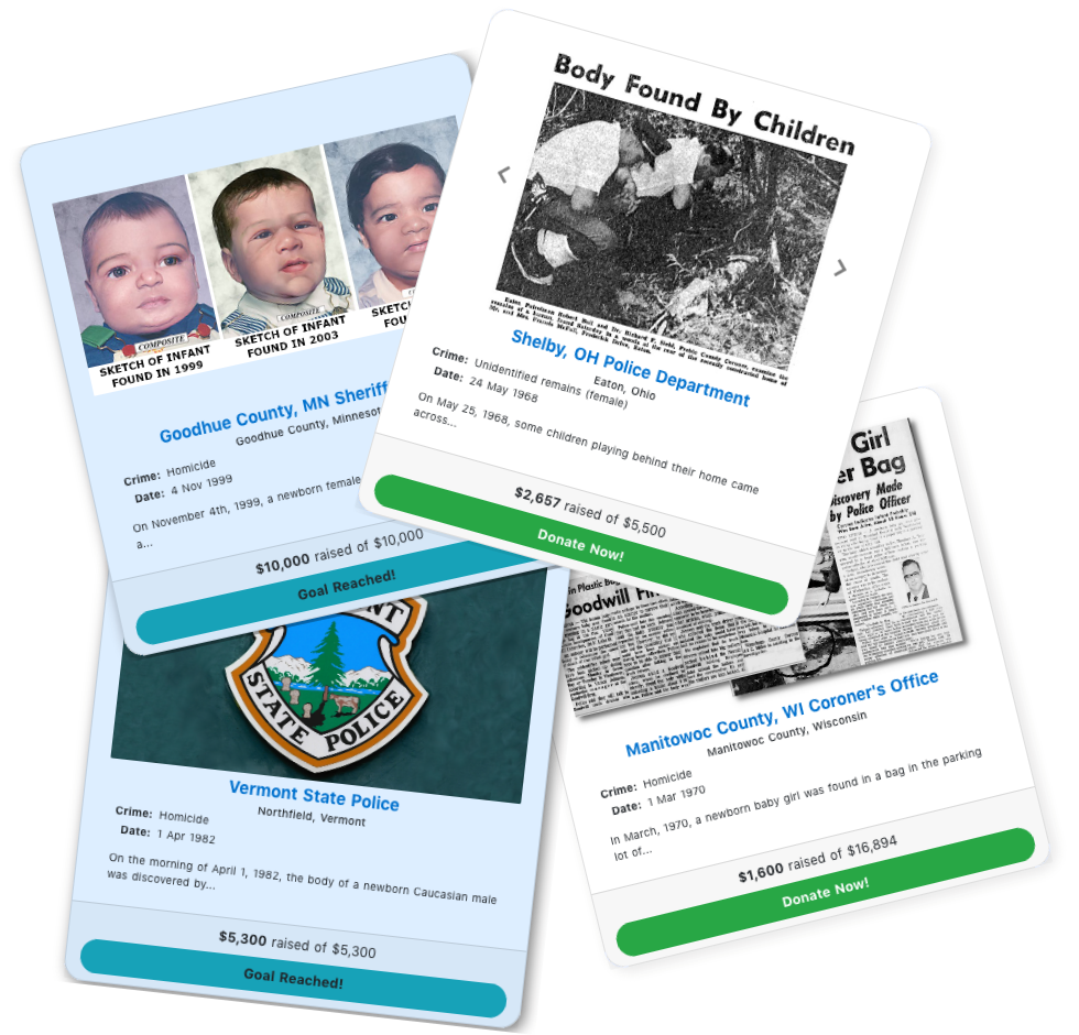 JusticeDrive is a free crowdfunding portal dedicated to helping law enforcement agencies, victim advocates, and concerned citizens raise funds to advance criminal investigations. The site provides tools for law enforcement agencies to direct funds to specific cases, and empowers individuals to contribute to the investigation of sexual assault, homicide, and unidentified remains cases across the country and around the world.